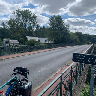 La traversée cycliste de la Loire se fait par le pont de chemin de fer bordé de cette drôle de voie cyclable, qui autorise seulement une vingtaine de cm de battement de part et d'autre des saccoches! Je m'applique au pilotage, car le passage est long de 600 m, et frotter à droite ou gauche entraînerait la chute.